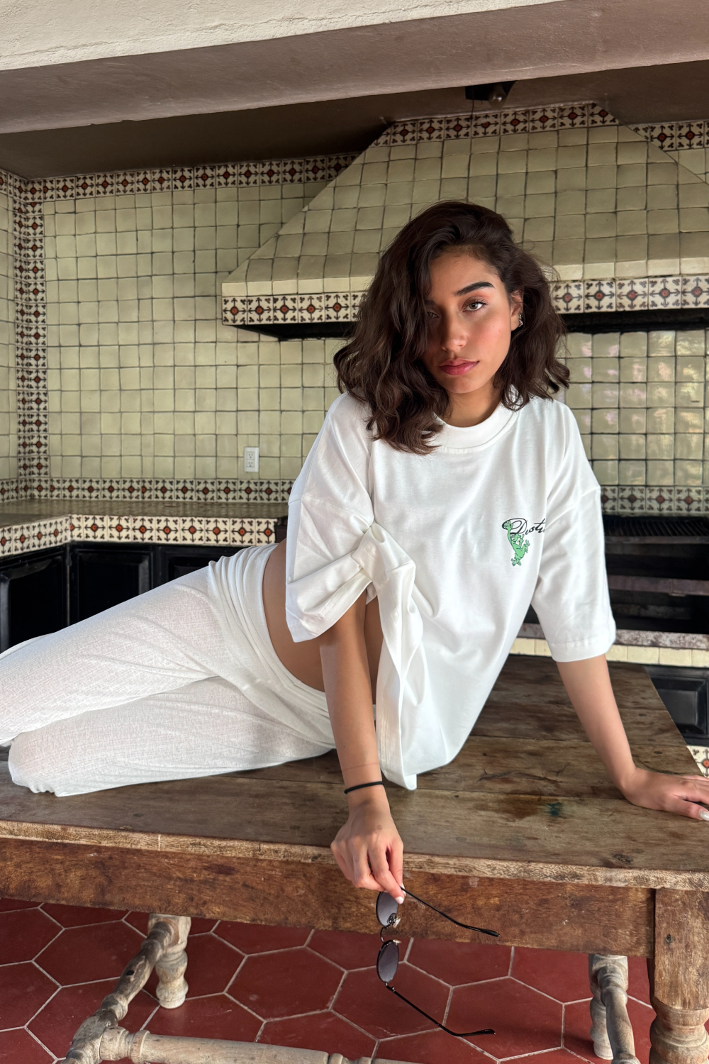 Si buscas un fit oversize equilibrado, te recomendamos pedir tu talla habitual — el corte es true to size, con el largo ligeramente más corto para lograr un look más estilizado sin perder el carácter oversize.